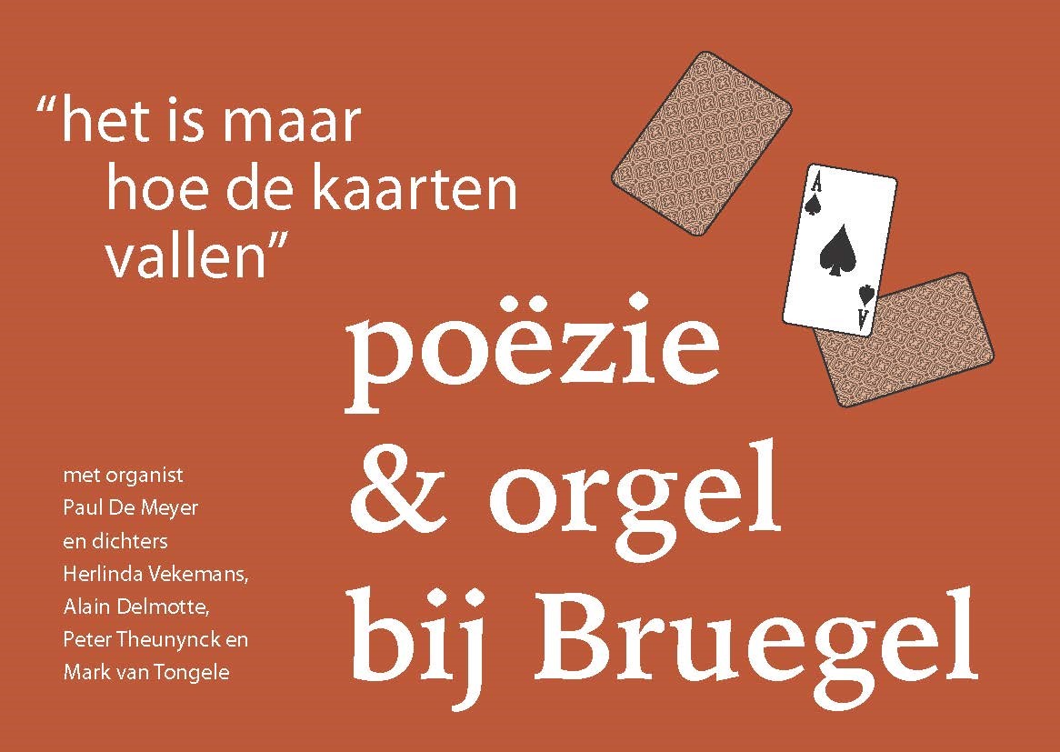 Voor “Het is maar hoe de kaarten vallen” kozen vier dichters elk een spreekwoord. Samen met organist Paul De Maeyer brengen ze gedichten en orgelmuziek die aanleunen bij de bonte wereld van een schilder wiens oeuvre tot ons collectief geheugen behoort, dit 450 jaar na het overlijden van Pieter Bruegel de Oude.